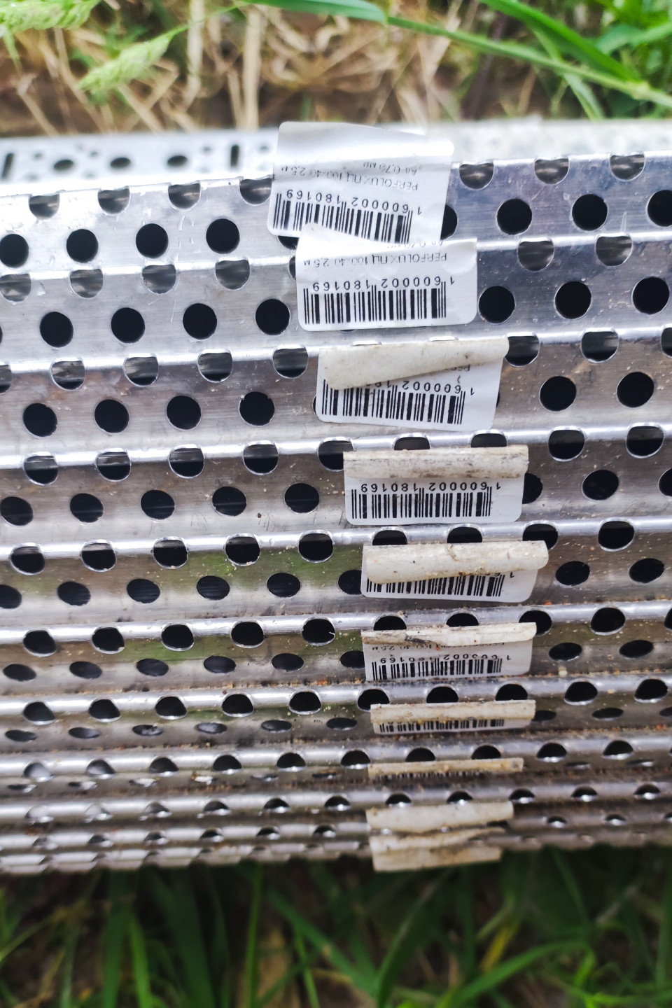 На фотографии запечатлена стопка перфорированных металлических листов, уложенных горизонтально. На поверхности каждого листа размещены наклейки со штрихкодами и маркировкой. Металл имеет равномерную перфорацию, изделие находится на улице, на фоне видна трава. Снимок выполнен крупным планом, подчёркивающим структуру и повторяемость элементов. Фотография может использоваться в материалах о строительных и промышленных материалах, логистике, складском учёте и производстве.