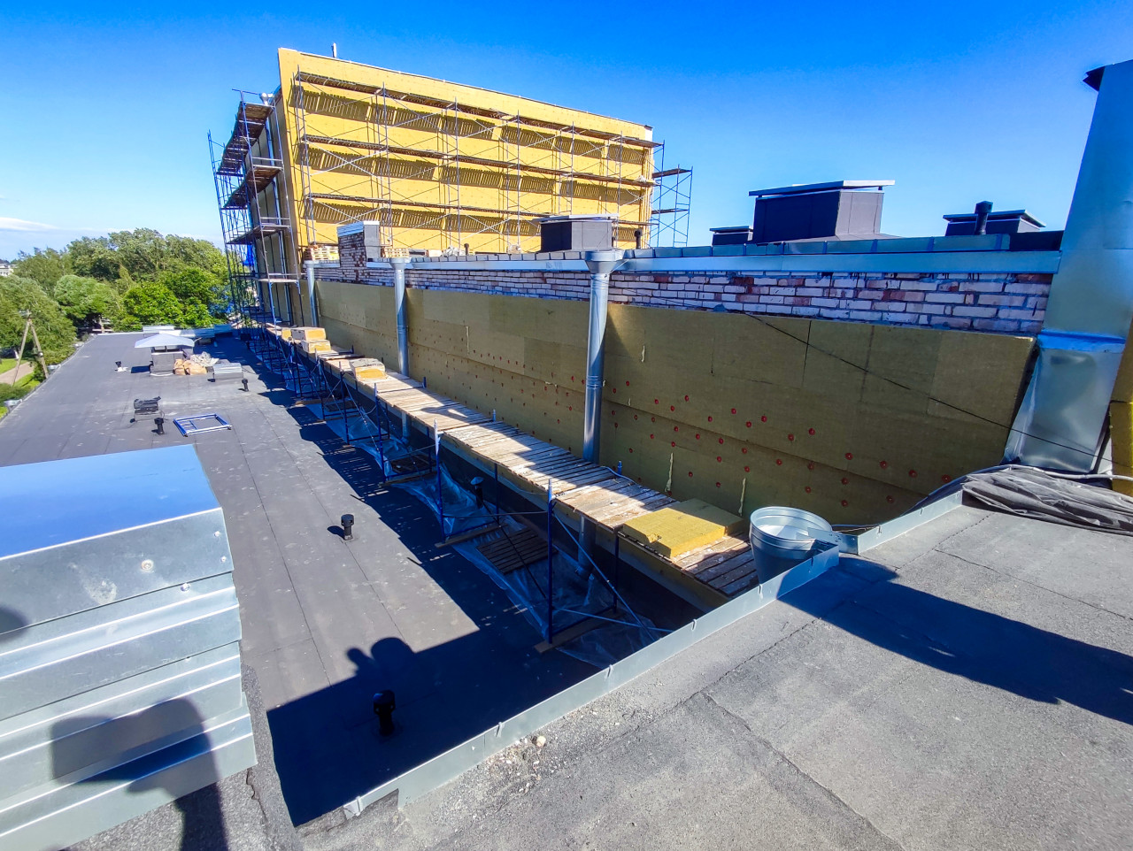 Перспективный вид вдоль плоской кровли: справа идёт фасадная стена, закрытая плитами минеральной ваты, закреплёнными тарельчатыми дюбелями, сверху — кирпичный парапет с металлическим колпаком. Вдоль стены установлен ряд строительных лесов с деревянным настилом, на кровле видны вентиляционные стояки и небольшие выходы. В кадре присутствуют водосточные трубы и примыкания кровельного ковра к парапету, на дальнем плане — ещё один корпус в лесах. Снимок подходит для материалов о капитальном ремонте, утеплении фасадов и работах на высоте, а также для учебных и технических публикаций.