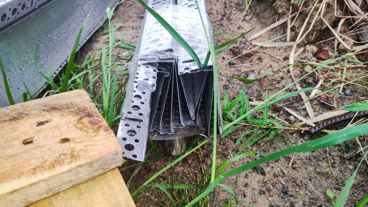 На фото лежит связка оцинкованных металлических профилей с перфорацией и острыми кромками, сложенных торцом к камере. На поверхности видны капли воды после дождя, рядом растёт трава и заметен песчаный грунт. В кадр попадает деревянная доска и ещё один длинный металлический элемент на заднем плане. Съёмка выполнена крупным планом на улице, акцент на фактуре металла и отверстиях. Фотография может быть использована в материалах о стройматериалах, складировании и логистике на стройплощадке. Подходит для иллюстрации тем про монтаж конструкций и комплектующие для отделочных работ.