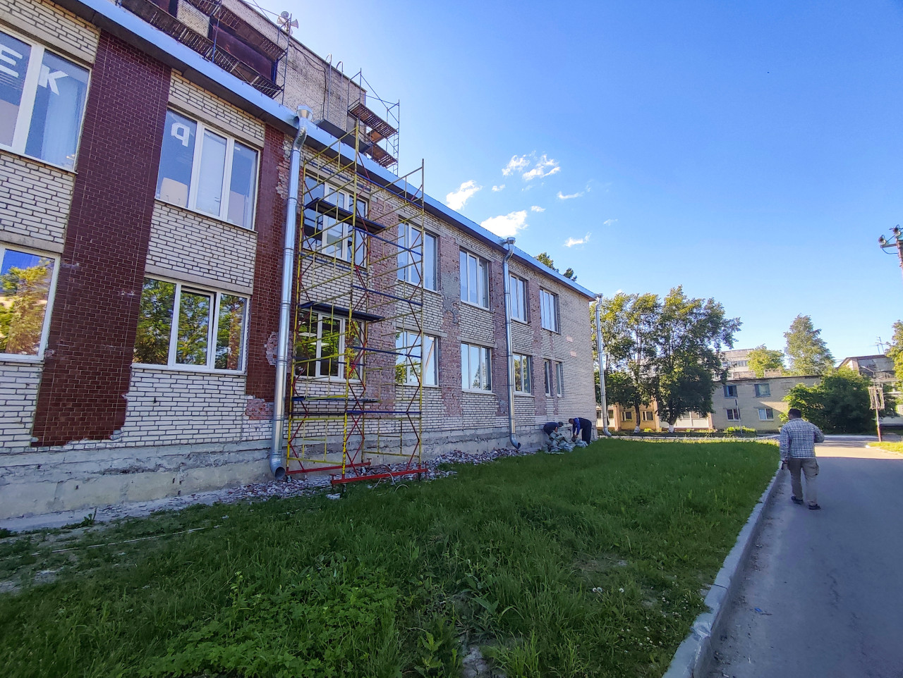 строительство ремонт реконструкция здание фасад строительные работы строительная площадка строительные леса высотные работы обслуживание здания город архитектура кирпичный фасад двухэтажный дом окна цоколь фасадные работы ремонт фасада вышка тура благоустройство городская среда проезд тротуар газон трава деревья водосток инженерные системы обслуживание зданий капитальный ремонт коммунальные работы летний день облакаПохожие фотографии