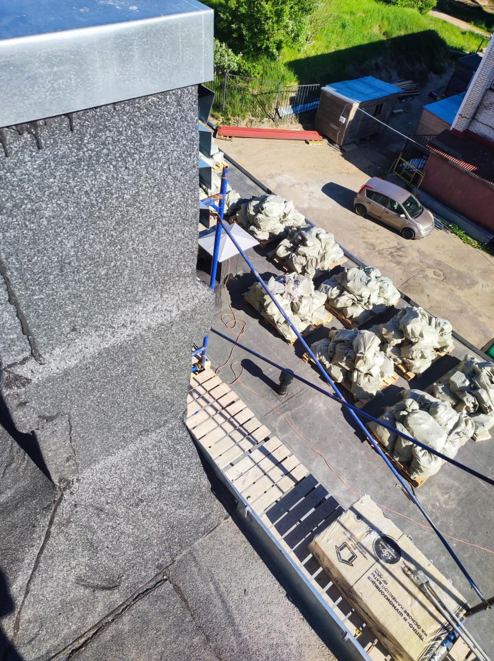 строительство ремонт реконструкция здание фасад строительные работы строительная площадка строительные леса высотные работы обслуживание здания кровля плоская крыша рулонная кровля гидроизоляция битумное покрытие парапет металлический колпак примыкание кровельные работы капитальный ремонт стройплощадка ограждение техника безопасности строительные материалы утеплитель демонтаж строительные отходы поддоны логистика двор городская инфраструктура сервисное обслуживание эксплуатация здания солнечный деньПохожие фотографии