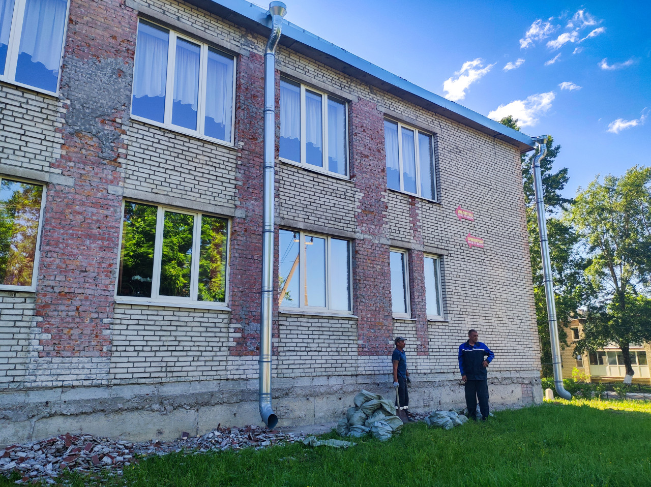 На фото показан фрагмент двухэтажного кирпичного здания: на стене заметны участки демонтированной штукатурки, открытая красная кладка и серые ремонтные пятна вокруг окон. Установлен новый металлический водосток с коленом у земли, под стеной лежит строительный мусор и мешки, рядом стоят двое рабочих. В окнах отражаются деревья и небо, на переднем плане газон; свет дневной, погода ясная. Сцена фиксирует этап подготовки фасада перед восстановлением покрытия. Использование: материалы о ремонте зданий, обследовании фасадов, организации демонтажных работ и коммунальном строительстве.