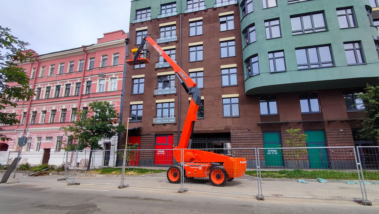 Санкт-Петербург, лето. Общий вид улицы, где автовышка AURORA выполняет работы у верхних этажей жилого дома: ярко-оранжевая техника и поднятая корзина выделяются на фоне кирпичного фасада и зелёной облицовки соседней части здания. Вдоль проезжей части выставлено металлическое ограждение, рядом стоят временные дорожные щиты; на заднем плане — розовый дом с декоративной отделкой, деревья и тротуары. В кадре видны парковочные места и спокойная городская среда. Снимок подходит для материалов о ремонте, обслуживании зданий и городской инфраструктуре.