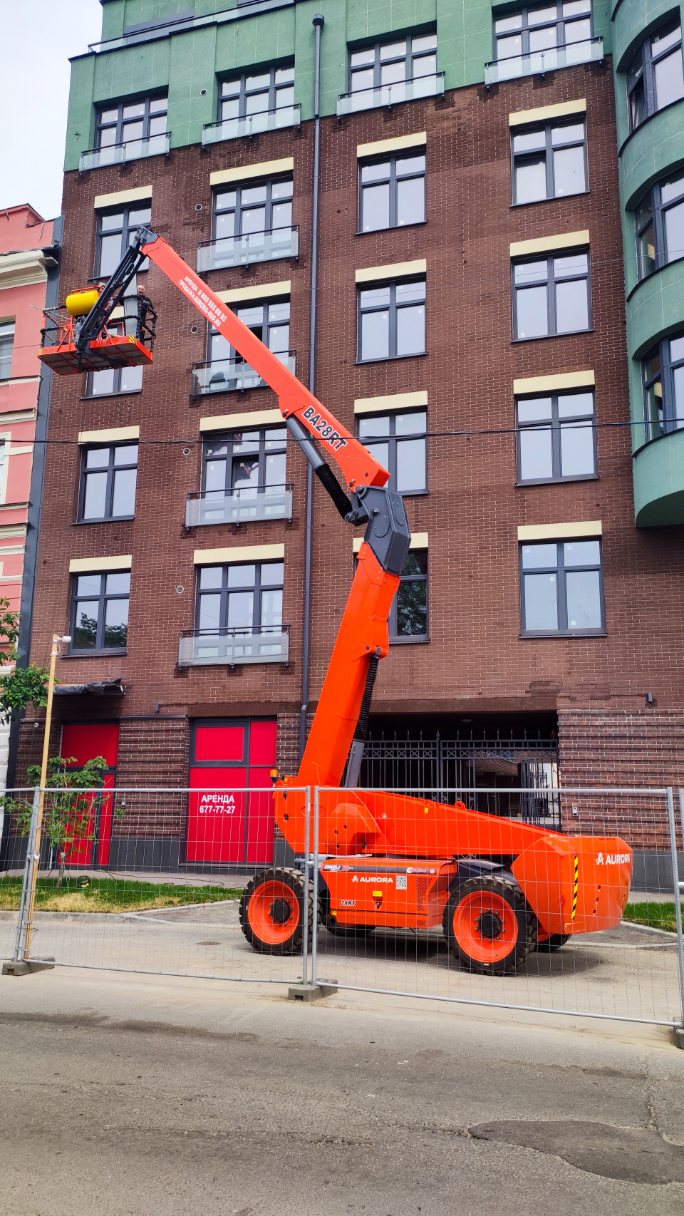 Санкт-Петербург, дневная съёмка. Крупный план телескопического подъёмника AURORA: массивная машина с крупными колёсами стоит за временным забором, стрела поднимает корзину к кирпичному фасаду многоэтажного дома. В корзине находится рабочий, рядом закреплён жёлтый баллон/контейнер и инструментальные элементы, что указывает на выполнение работ на высоте. На фоне видны ряды окон и небольшие балконы, внизу — асфальт и входные проёмы с яркими щитами «Аренда». Фото можно использовать для иллюстраций о подъёмной технике, обслуживании зданий и охране труда.