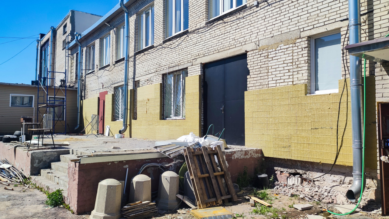 строительство ремонт реконструкция здание фасад строительные работы строительная площадка строительные леса высотные работы обслуживание здания фасадные работы утепление фасада теплоизоляция минераловатные плиты минеральная вата утеплитель кирпичное здание кирпичная кладка цоколь водосточная труба окна решётки на окнах ворота входная дверь стройматериалы поддон строительный мусор демонтаж двор промышленная архитектура энергосбережение термомодернизация лето июнь 2024Похожие фотографии