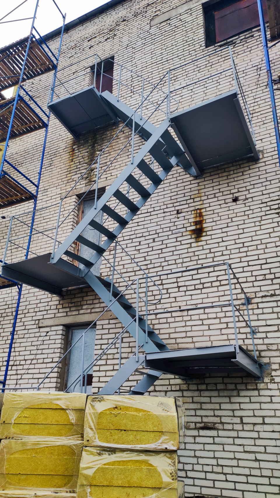 На фото общий вид фасада кирпичного здания в процессе ремонта: установлена серая наружная металлическая лестница с несколькими площадками и перилами, лестничные марши закреплены к стене. Слева видны синие строительные леса с настилами, внизу сложены и упакованы в пленку плиты утеплителя минеральной ваты. На стене заметны потеки и следы коррозии, окна и проемы частично закрыты или без отделки. Съемка при дневном свете, облачное небо. Фото подойдет для тем о реконструкции, пожарной эвакуации, утеплении фасадов и монтаже металлоконструкций.