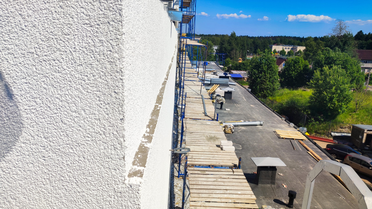 строительство ремонт реконструкция здание фасад строительные работы строительная площадка строительные леса высотные работы обслуживание здания ремонт здания штукатурка фактура штукатурки белая стена леса настил работа на высоте техника безопасности плоская кровля кровельное покрытие вентиляция вентиляционные выходы воздуховоды металл стройматериалы доски упаковка инструмент промышленное здание панорама деревья городская окраина лето июнь 2024Похожие фотографии