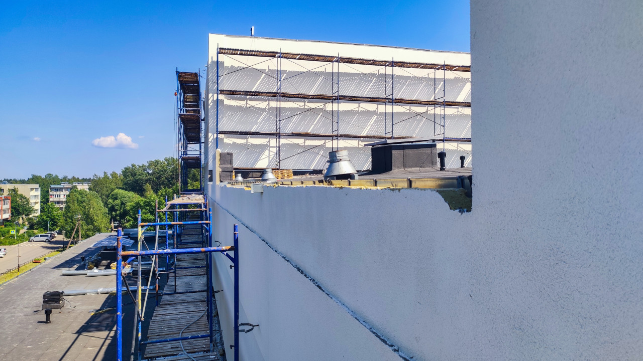 строительство ремонт реконструкция здание фасад строительные работы строительная площадка строительные леса высотные работы обслуживание здания белый фасад настил работа на высоте плоская кровля край кровли парапет утеплитель теплоизоляция кровельный пирог гидроизоляция вентиляционный выход вентиляция металл примыкание строительный контроль техника безопасности городская среда дорога деревья жилые дома лето июнь 2024 ремонт кровлиПохожие фотографии