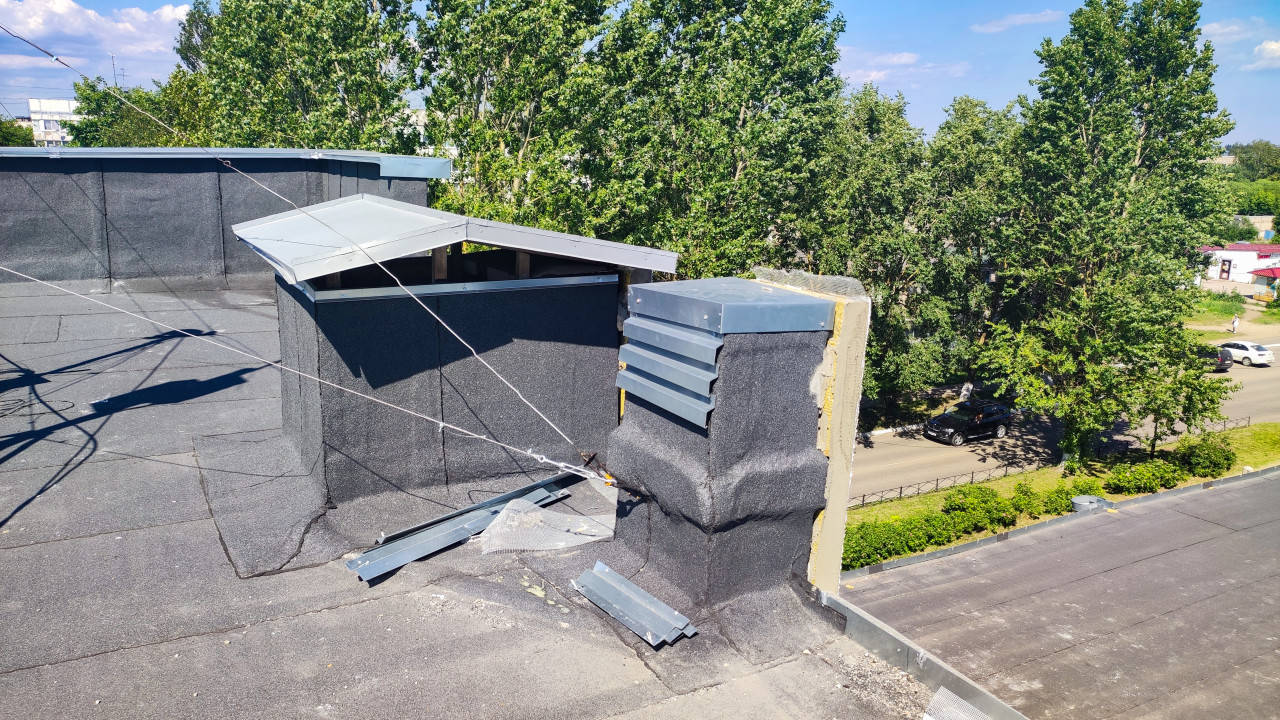 Вентиляционная шахта с металлическим козырьком на плоской кровле с рулонной гидроизоляцией