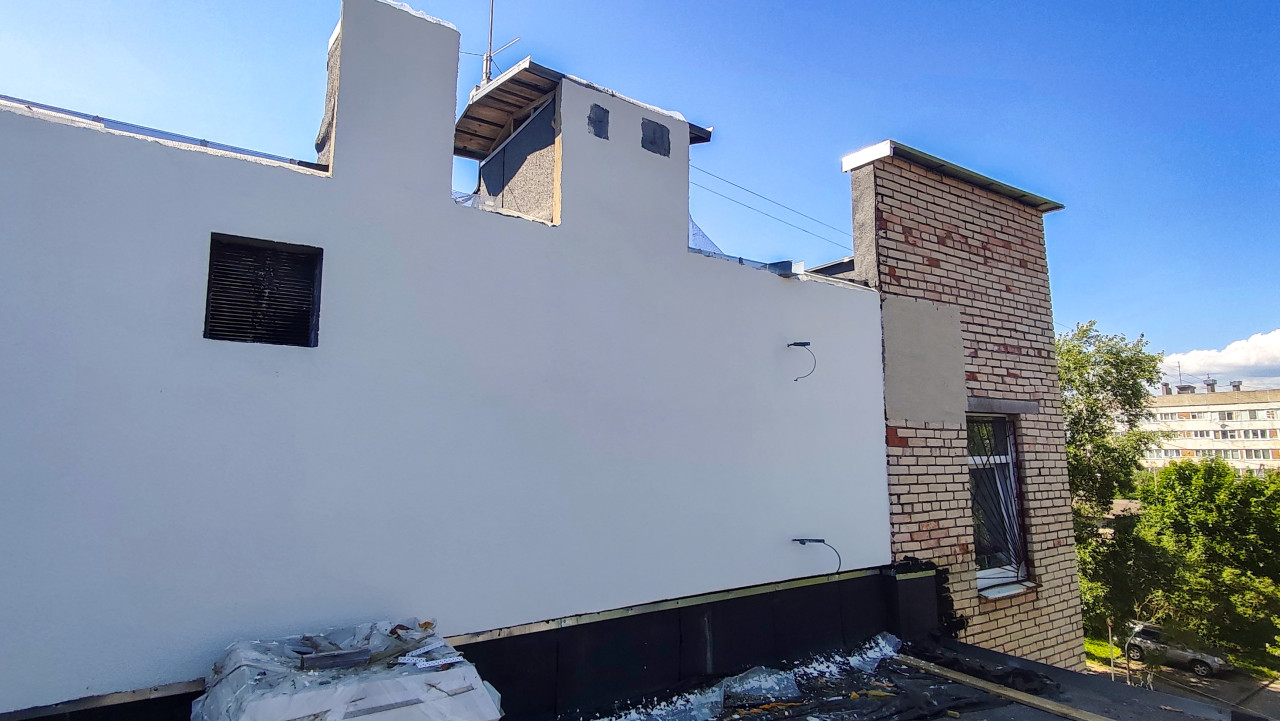 На фотографии показан верх здания: белый оштукатуренный парапет с неровной верхней линией и свежими следами отделки соседствует с кирпичной шахтой и небольшими технологическими проёмами. У кромки крыши лежат обрезки материалов и строительный мусор, виден чёрный фартук примыкания по нижней части стены. Небо ярко-синее, освещение дневное, летнее; вдалеке просматриваются деревья и жилые дома. Снимок подходит для материалов о ремонте парапетов, восстановлении примыканий кровли и фасадных работах на высоте.