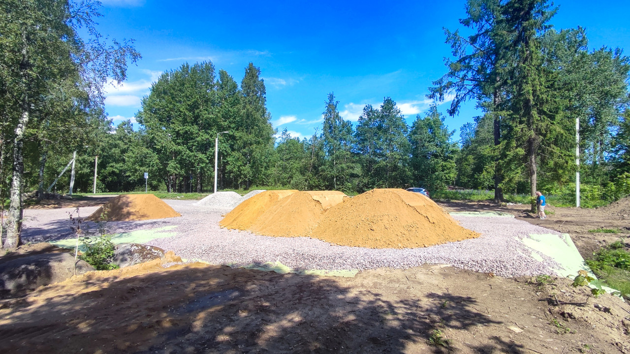 строительная площадка стройка стройплощадка строительный участок строительство строительные работы благоустройство земляные работы песок куча песка щебень гравий геотекстиль инертные материалы склад материалов отсыпка планировка следы техники тени лесопарк деревья берёза ель опора освещения человек припаркованный автомобиль лето солнечный день голубое небо облака дорожные работы инфраструктураПохожие фотографии