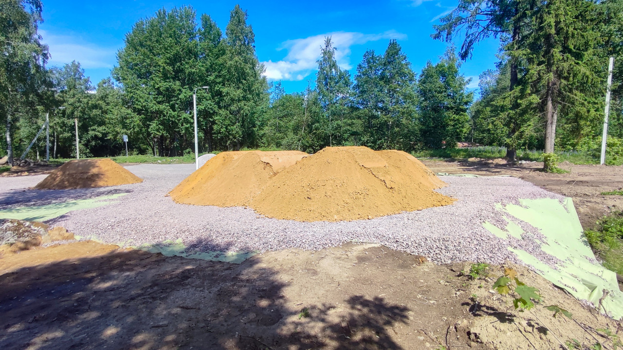 строительная площадка стройка стройплощадка строительный участок строительство строительные работы благоустройство площадка дорожки подготовка основания щебёночная подушка щебень песок куча песка геотекстиль инертные материалы отсыпка планировка грунт следы техники лесопарк деревья берёза ель опора освещения тень лето солнечный день голубое небо облака ландшафтные работы инфраструктураПохожие фотографии