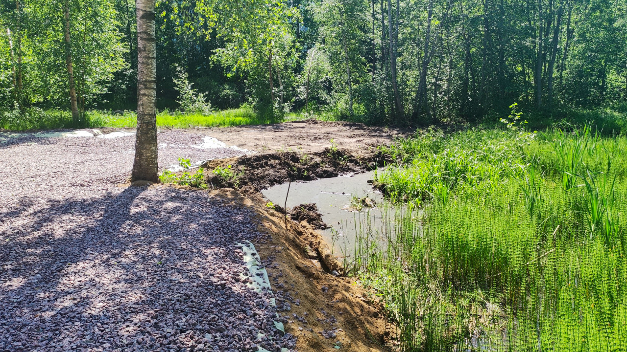 Участок благоустройства рядом с водой: слева видна свежая щебёночная отсыпка на зелёном геотекстиле, по краю проходит песчаный откос. Справа располагается небольшой водоём или затопленная выемка с мутной водой, вокруг растут камыши и высокая трава, заметны молодые кусты. В центре кадра — ствол берёзы и тени от листвы, на заднем плане плотный лес и расчищенная грунтовая площадка после работ. Фото подходит для тем об устройстве оснований, работе в прибрежной зоне, экологии и благоустройстве территорий.