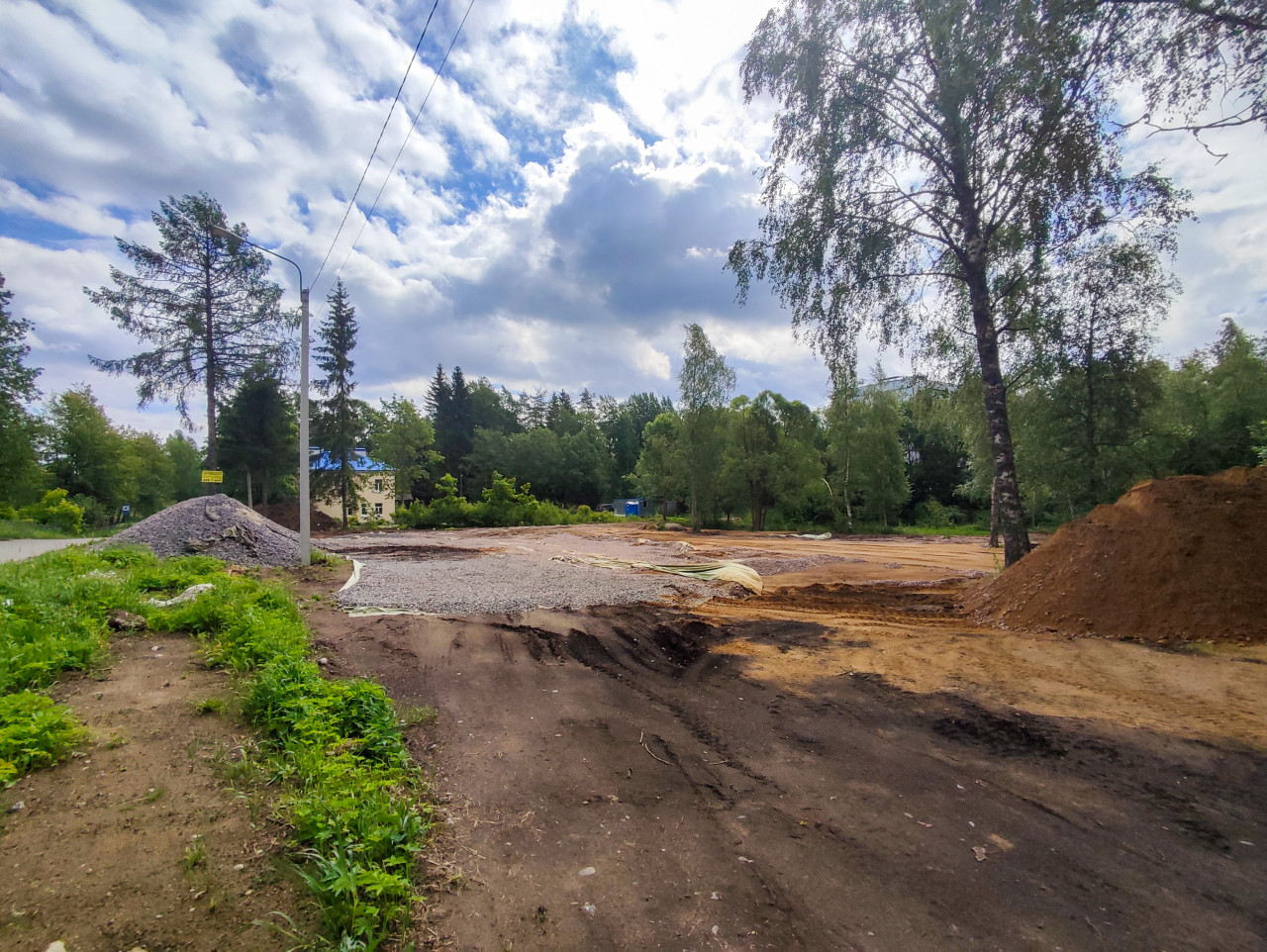 строительная площадка стройка стройплощадка строительный участок строительство строительные работы земляные работы благоустройство инфраструктура площадка подготовка территории отсыпка щебнем щебень гравий геотекстиль грунт насыпь планировка строительные материалы дорожные работы ремонт дороги опора освещения линии электропередачи берёза лес деревья зелень небо облака пригород ландшафт строительный процесс основаниеПохожие фотографии