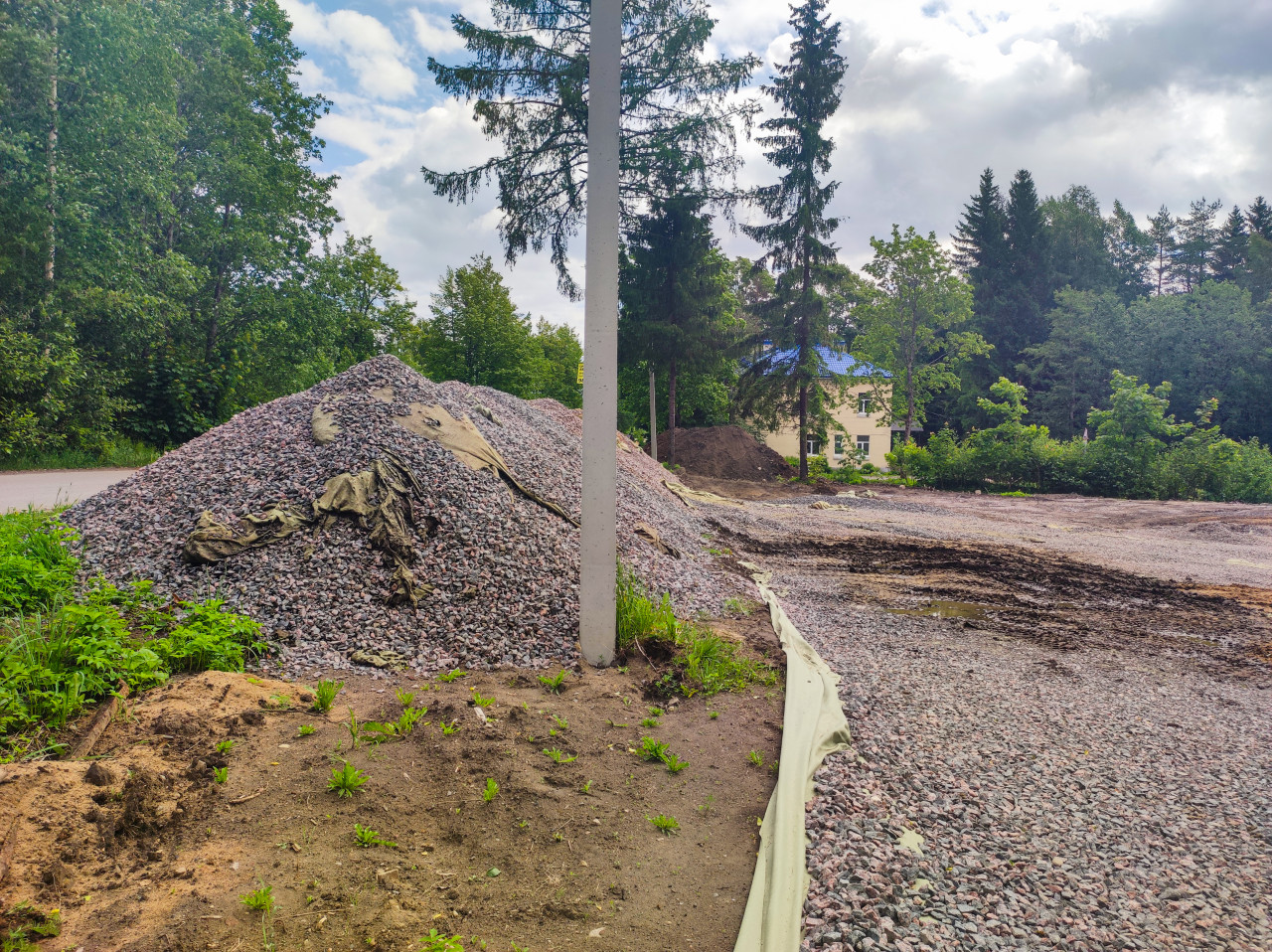 На фото показана стройплощадка на окраине леса: крупные кучи щебня лежат рядом с участком отсыпки, местами видна уложенная светлая геотекстильная ткань. В центре кадра стоит железобетонный столб, по краю — влажный грунт и молодая растительность; на поверхности заметны следы планировки и небольшая лужа. На заднем плане среди деревьев видно здание с синей крышей. Изображение подойдёт для тем о благоустройстве, дорожных работах, подготовке основания и строительных материалах. В кадре нет рабочих и техники, акцент на материалах и этапах подготовки основания.