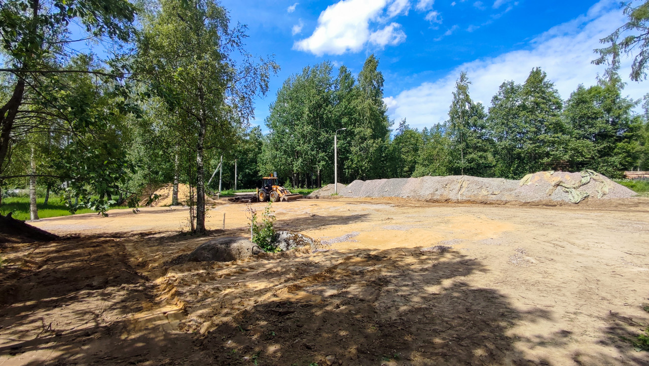строительная площадка стройка стройплощадка строительный участок строительство строительные работы подготовка территории земляные работы планировка уплотнение грунта спецтехника фронтальный погрузчик щебень песок насыпи складирование брезент дорожные работы колеи следы колёс лес деревья опоры освещения лето солнечный день голубое небо облака благоустройство инфраструктура промышленный пейзаж разровненная площадка строительные материалыПохожие фотографии