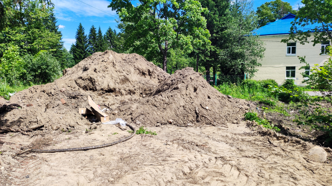 Кучи вынутого грунта рядом со зданием с синей крышей на фоне леса