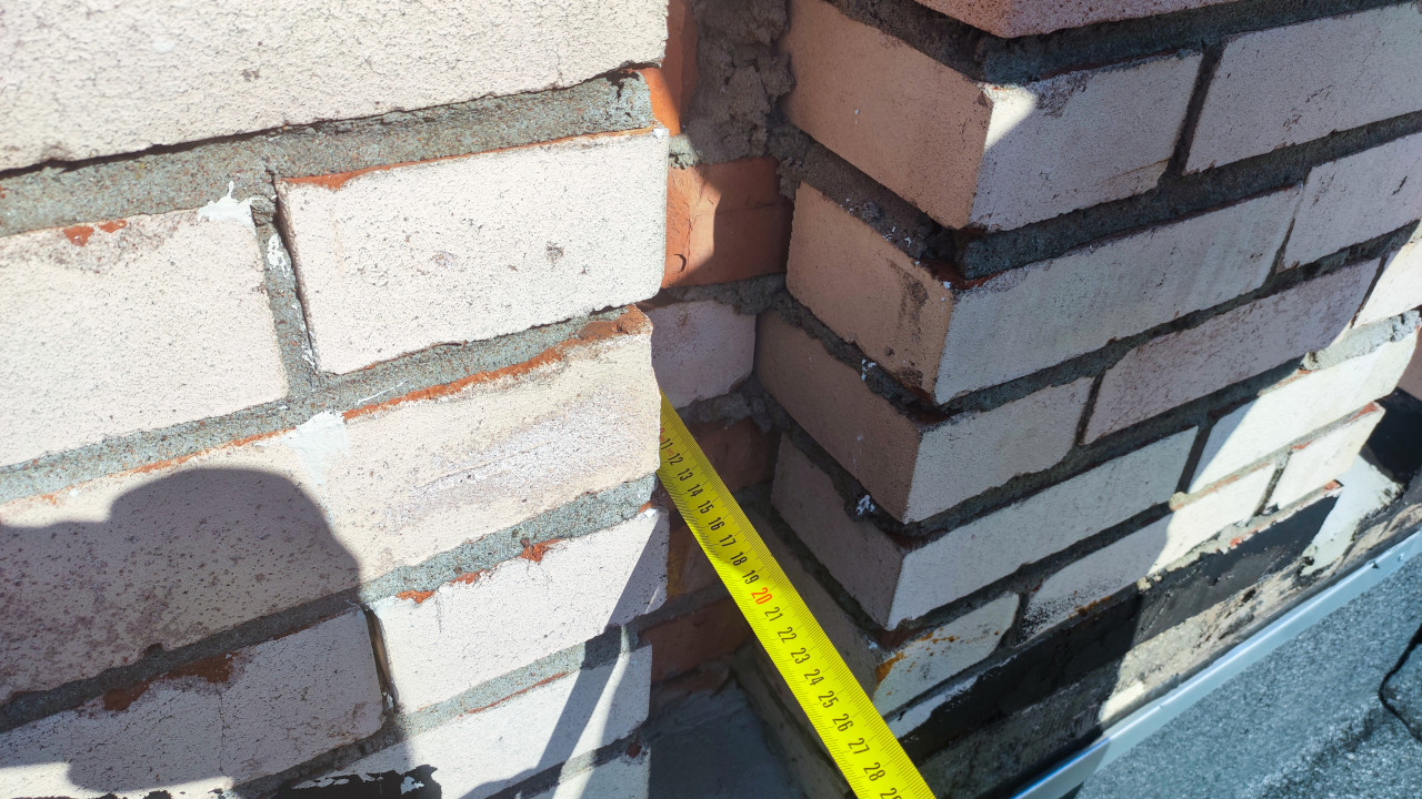 Крупный план кирпичного угла на крыше: рулетка вставлена в щель между двумя стенками, шкала направлена вниз, что позволяет оценить глубину и геометрию зазора. По кирпичам видны следы раствора, неровные кромки и потемнения в зоне примыкания, у основания проходит слой гидроизоляции и металлическая планка. На поверхности падает тень от человека и конструкций. Фото можно использовать для технических отчётов, инструкций по ремонту примыканий, а также для материалов о контроле качества кладки и замерах на строительном объекте.