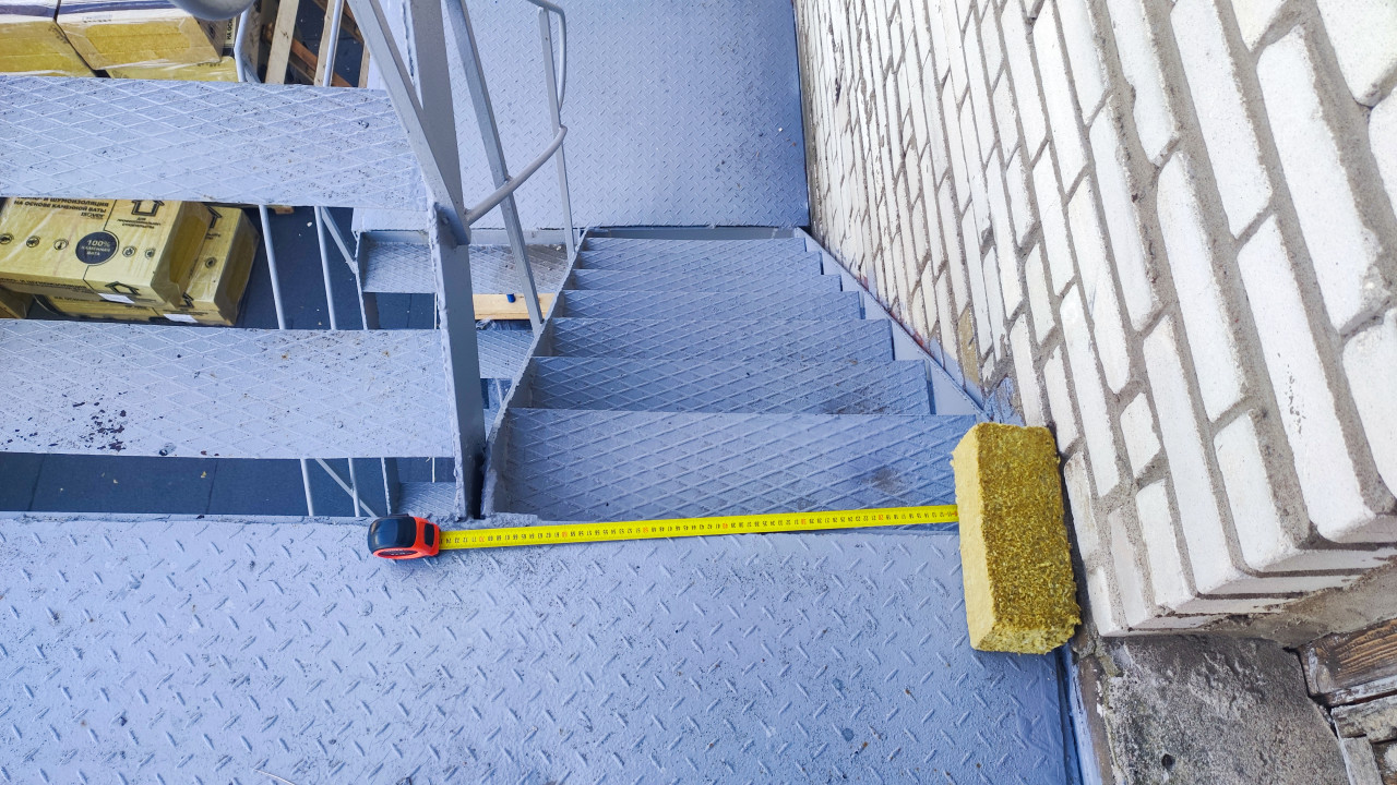 Рулетка и минераловатный утеплитель на металлической лестнице плоской кровли