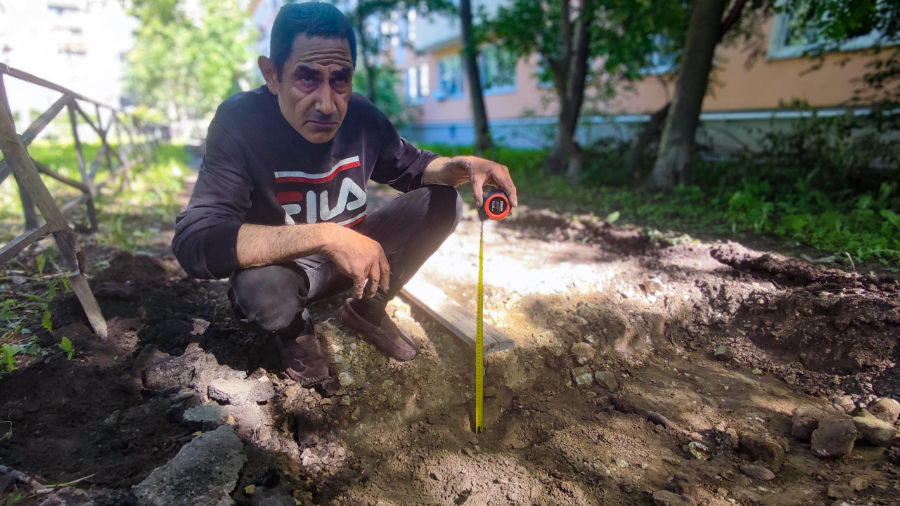 Рабочий с рулеткой у раскопа на дворовой дорожке