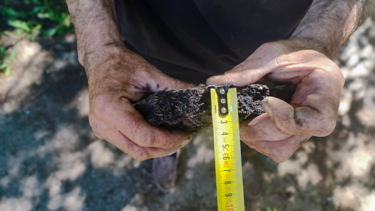 Крупный план рук рабочего: в ладонях удерживается обломок старого покрытия с грунтом и щебнем, а крючок рулетки зацеплен за край, чтобы измерить толщину слоя. На коже заметны следы грязи и пыли, на куске материала видна крошка и неоднородная структура, характерная для изношенного основания. Фон размытый, с пятнами солнечного света на земле. Фото можно использовать для материалов о дефектовке покрытий, проверке толщины асфальта, строительной экспертизе и фотофиксации при ремонте тротуаров и дворовых проездов.