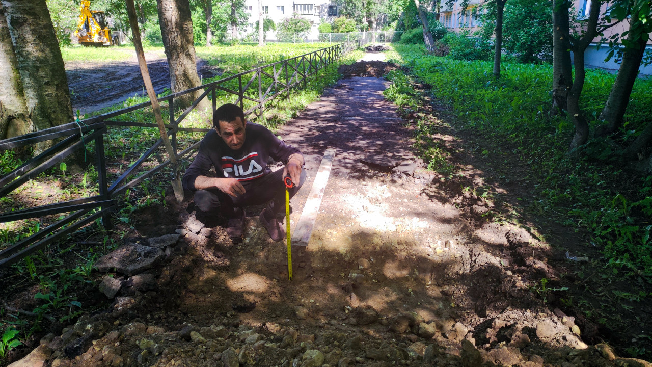 Широкий кадр дворовой зоны ремонта: рабочий присел у большой выемки на дорожке и замеряет глубину рулеткой, рядом лежит доска и стоит лопата. По обе стороны дорожки растёт трава и кусты, вдоль проходит низкое металлическое ограждение, впереди видны насыпи вынутого грунта. Вдалеке на площадке находится жёлтая спецтехника, вокруг высокие деревья и жилые дома. На одежде рабочего заметен логотип FILA. Фото можно использовать для новостей ЖКХ, отчётов о благоустройстве, материалов о земляных работах и контроле параметров при ремонте дорожек.