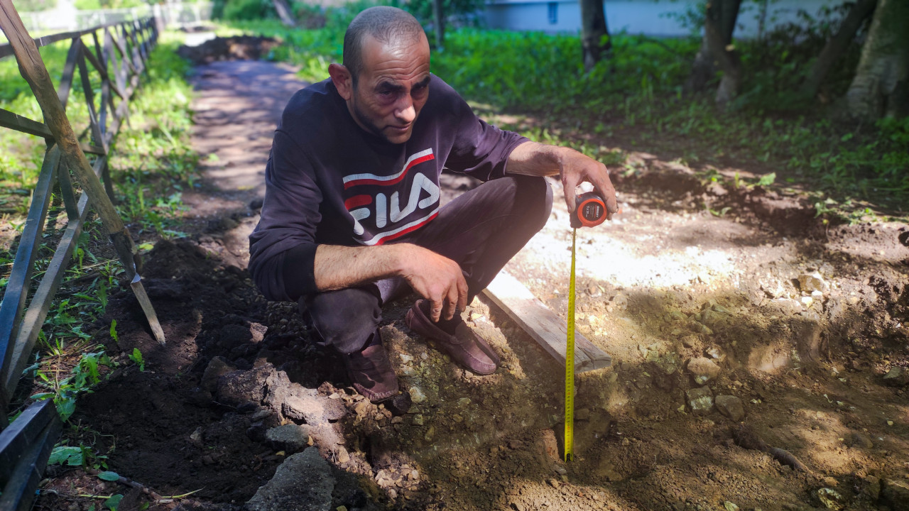 рулетка линейка измерение размеры сантиметры измерения измерительные работы обмеры замеры исследование качество контроль контроль качества проверка качества оценка качества экспертиза строительство благоустройство ремонт дорожки подготовка основания измерение глубины рабочий раскоп выемка грунта песок щебень камни слои основания доска для прохода лопата металлическое ограждение двор зелёная зона деревья травяной покров тень солнечный день фотофиксация технадзор контроль работ коммунальные службы FILAПохожие фотографии