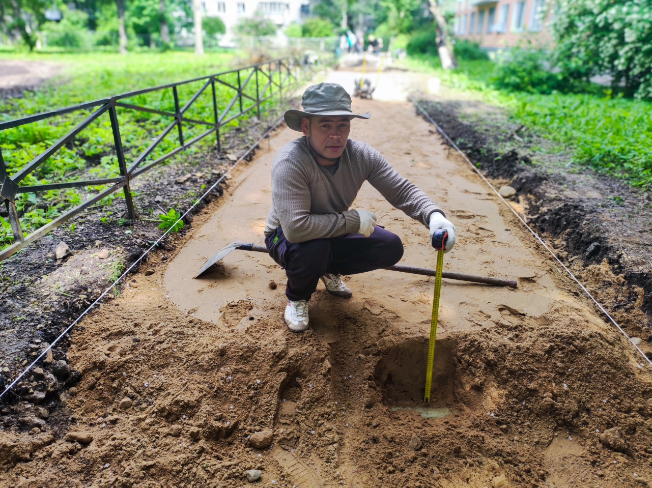 В центре кадра мужчина в рабочей одежде и перчатках присел на подготовленное песчаное основание и измеряет глубину выемки рулеткой. По краям дорожки натянуты шнуры разметки, рядом лежат ручные инструменты, видны следы выравнивания песка и кромки грунта. Слева проходит металлическое ограждение, на заднем плане размыто видна техника и люди, справа — кусты и фасад здания. Съёмка выполнена во дворе в дневное время. Использование: материалы о контроле качества при благоустройстве, устройстве оснований, измерениях на стройплощадке и ручных работах.