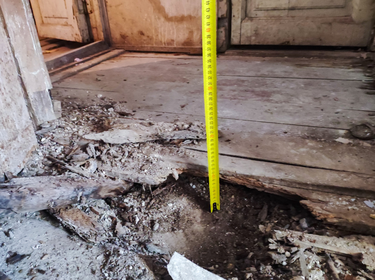 Фрагмент пола в старом помещении: доски повреждены и частично провалились, образовав яму с осыпавшимся мусором и древесными остатками. В центре кадра установлена строительная рулетка, по которой фиксируют глубину провала относительно уровня пола; рядом видны крошка штукатурки и тёмные следы загрязнения. На заднем плане — двери и порог, подчёркивающие бытовой контекст. Снимок подходит для иллюстраций о техническом обследовании зданий, фиксации дефектов перекрытий, подготовке актов и смет, а также материалов о капитальном ремонте и безопасности.