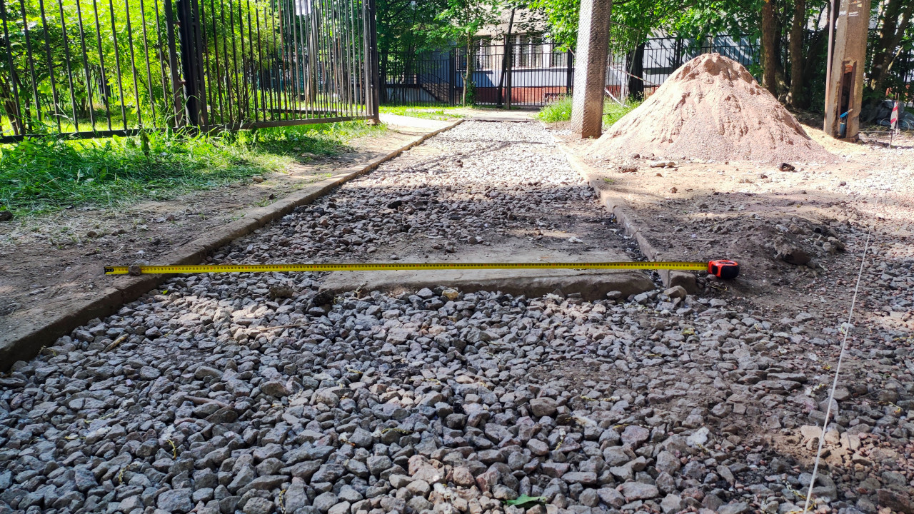Измерение ширины дорожки с щебнем рулеткой рядом с кучей песка