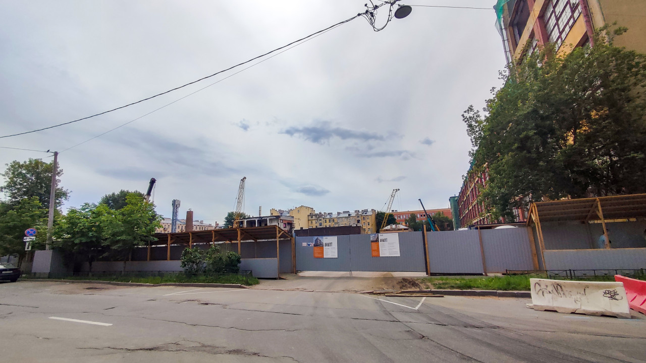 город строительство стройплощадка строительный забор ворота паспорт объекта avant строительная техника краны подъёмный кран реконструкция монтаж городская улица проезжая часть асфальт дорожная разметка бетонные блоки временные ограждения дорожные знаки остановка запрещена деревья зелёные насаждения воздушные провода уличный фонарь облачное небо безопасность городская инфраструктура временные сооружения организация работ панорама AVANTПохожие фотографии