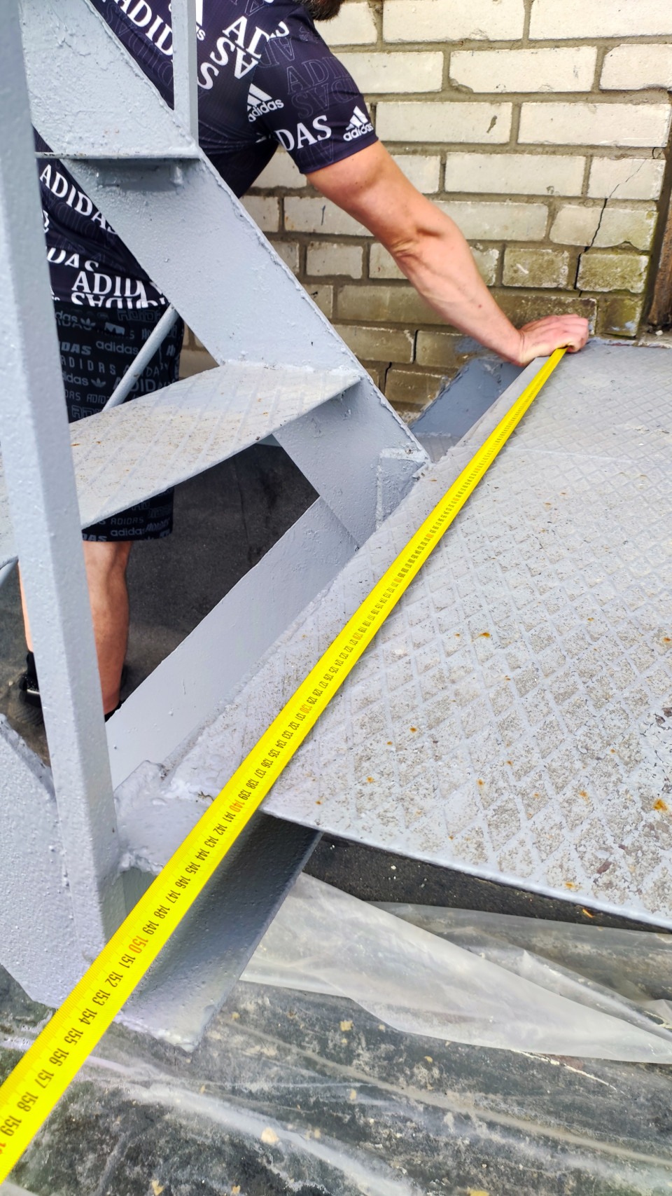 рулетка линейка измерение размеры сантиметры измерения измерительные работы обмеры замеры исследование качество контроль контроль качества проверка качества оценка качества экспертиза строительство ремонт монтаж рабочий измерительная лента контроль размеров металлоконструкции металлическая лестница лестничная ступень лестничная площадка рифленый настил противоскользящий лист сварные швы стальная рама окрашенный металл серый цвет кирпичная стена фасад строительная площадка защитная пленка инструменты техника безопасности Adidas промышленный объектПохожие фотографии