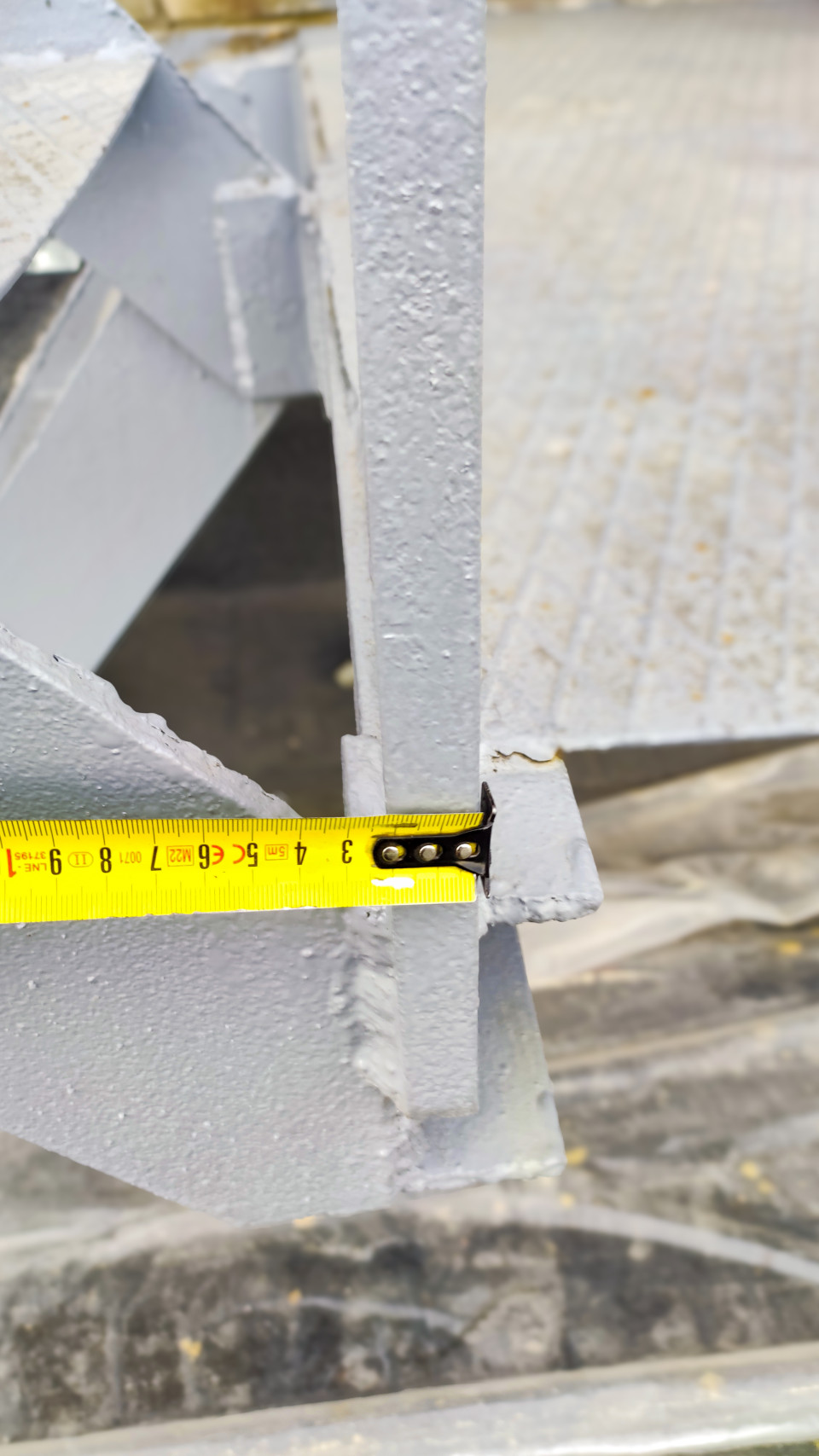 Крупный план строительного замера: крюк рулетки зацеплен за край металлического элемента, шкала проходит вдоль торца и показывает небольшое расстояние. В кадре видны слои серой краски, шероховатая фактура металла, сварной шов и кромка рифленого настила на заднем плане. Под конструкцией лежит прозрачная защитная пленка с пылью и мусором от работ. Ракурс подчеркивает точку опоры и метод измерения при сборке или подгонке деталей. Фото подходит для инструкций, отчетов и статей о монтаже металлоконструкций и контроле размеров.