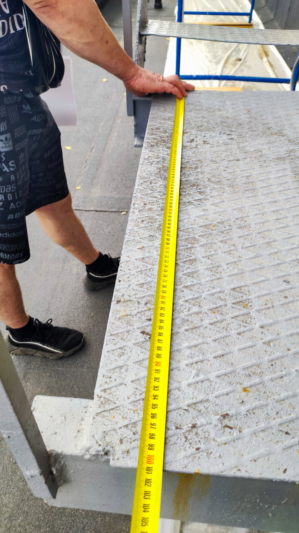 Снимок показывает процесс измерения длины металлической площадки: желтая рулетка лежит по рифленому настилу, рука удерживает начало у торца конструкции. В кадре видны ноги работника в кроссовках, окрашенная металлическая рама и кромка настила с загрязнениями от стройработ. На заднем плане просматриваются элементы временных ограждений и синяя строительная рама, под ногами асфальтовое покрытие. Свет дневной, ракурс сверху подчеркивает шкалу рулетки и фактуру металла. Фото подойдет для статей о приемке работ, монтаже металлоконструкций и строительных измерениях.