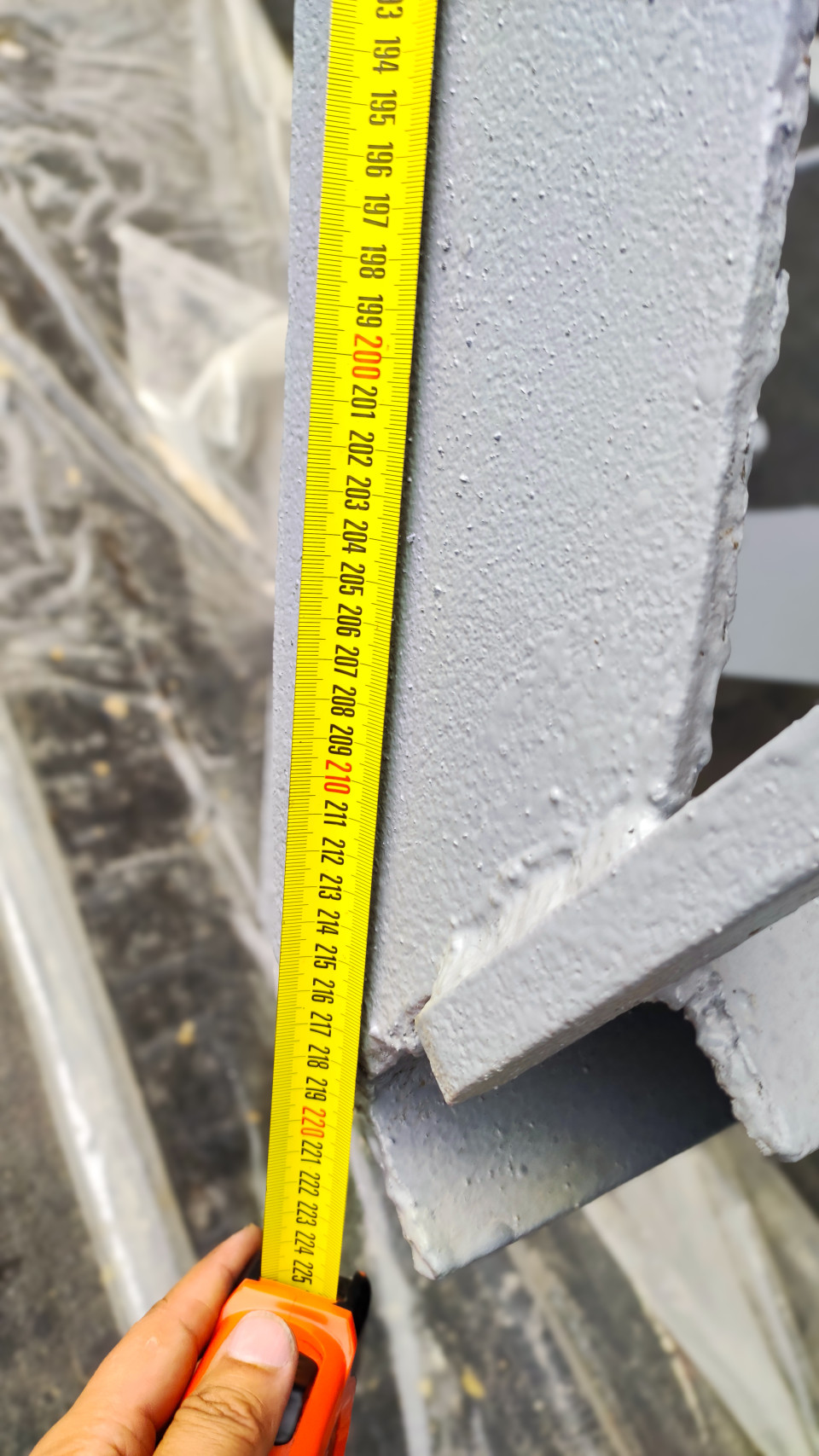 На фото рука держит рулетку в оранжевом корпусе и выполняет вертикальный замер вдоль серой металлической стойки. Шкала проходит рядом со сварным узлом и выступающей площадкой, видны неровности окраски, кромки и следы подкраски. Фоном служит рабочая зона с защитной пленкой на полу и частями металлической рамы. Снимок сделан днем, композиция сосредоточена на инструменте и точке измерения. Подходит для материалов о проверке размеров, монтаже лестниц, контроле качества и подготовке отчетов по ремонту.