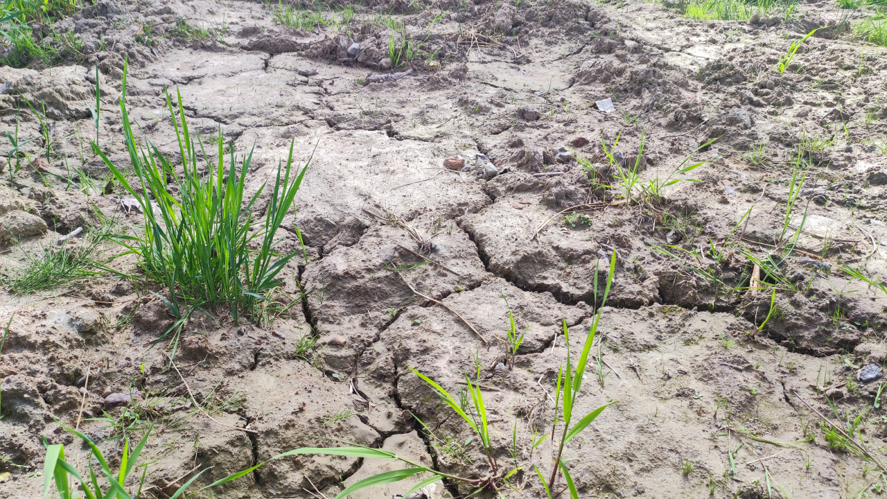 Трещины в подсохшем грунте с зелёными побегами и сухими стеблями