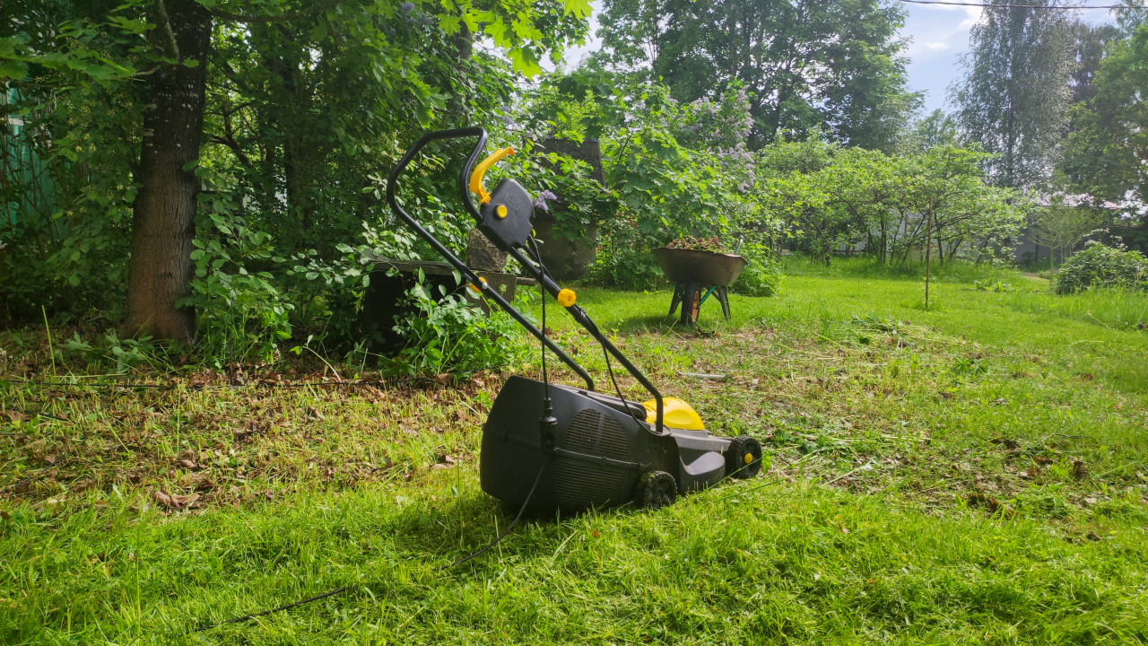 Электрическая газонокосилка с кабелем на газоне приусадебного участка