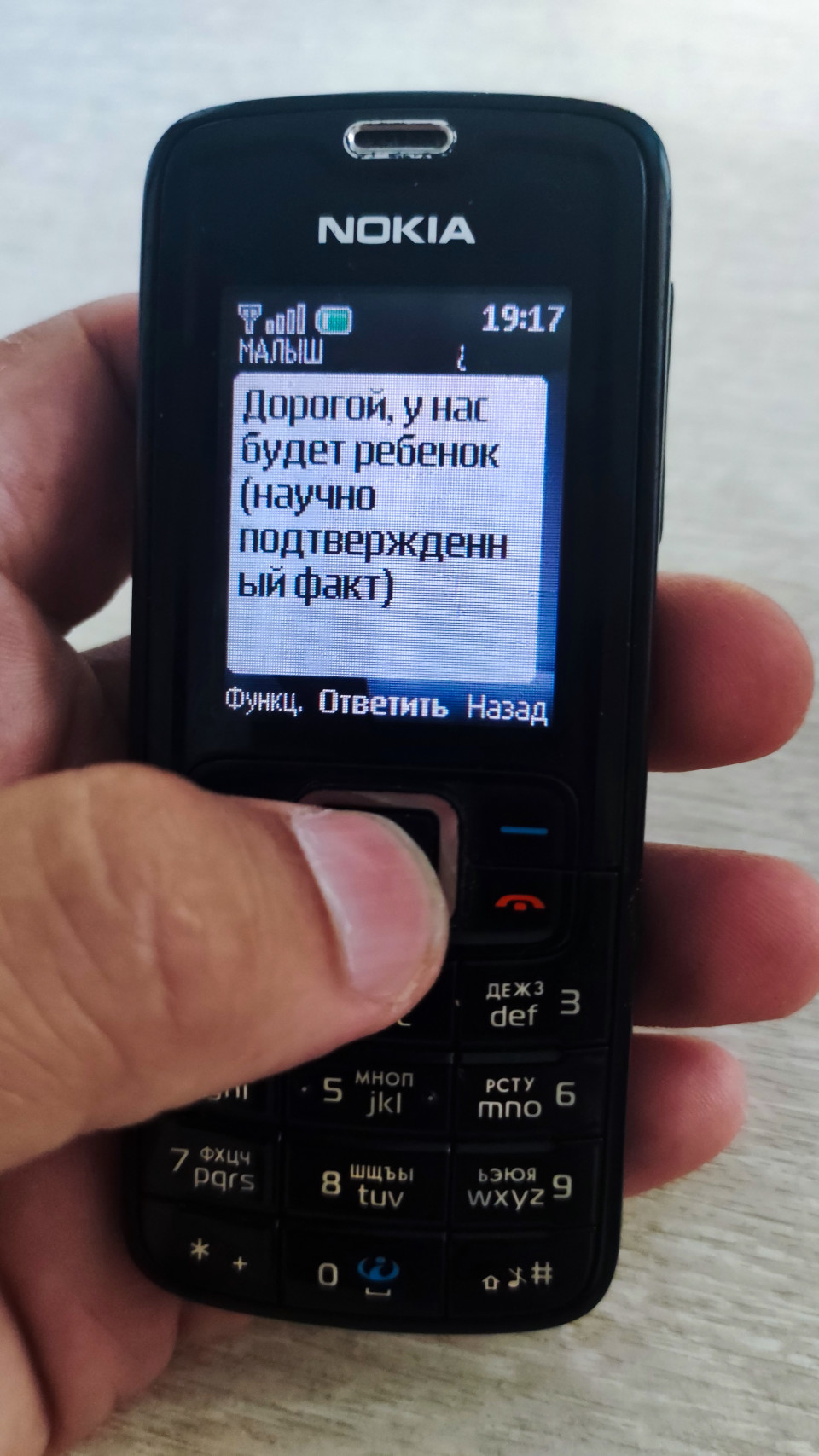 SMS на экране Nokia с текстом о будущём ребёнке и подписью контакта «МАЛЫШ»