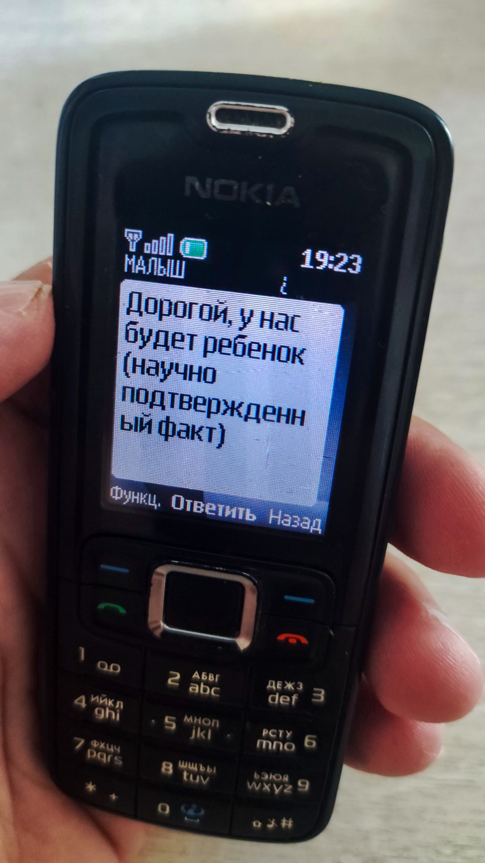 Крупный план: в руке держат телефон Nokia с открытым SMS, заполненным текстом на русском языке. Вверху экрана указано имя контакта «МАЛЫШ», справа отображается время 19:23; в тексте читается фраза про будущего ребёнка и «научно подтвержденный факт». Видны кнопки управления сообщениями в нижней строке интерфейса, а также часть физической клавиатуры и навигационной клавиши. Фон размытый, светлый, съёмка выполнена в помещении. Фото подходит для материалов о мобильной коммуникации, личных сообщениях, отношениях и объявлениях через SMS.