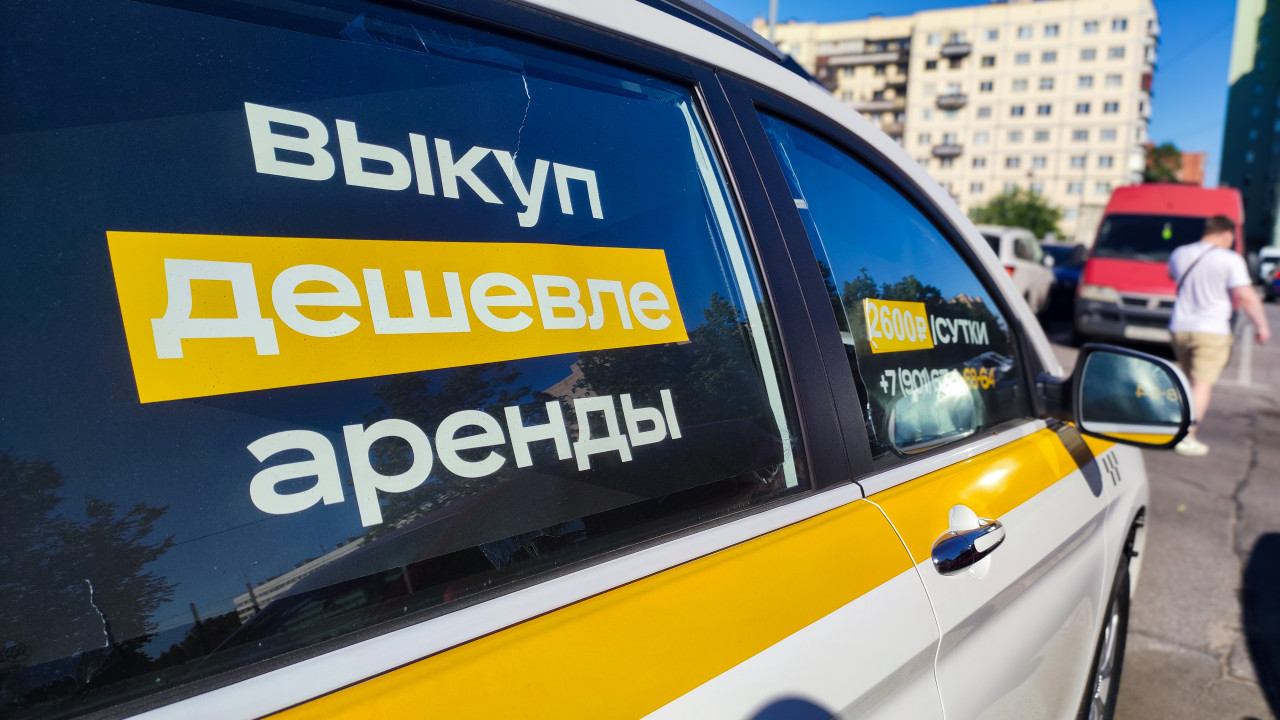 Уличная парковка в Санкт-Петербурге, лето 2024: рекламная надпись «Выкуп дешевле аренды» на боковом стекле автомобиля в бело-жёлтой оклейке. В кадре хорошо читается типографика, видны края прозрачной плёнки, мелкая пыль на стекле и отражения деревьев. Справа попадает зеркало заднего вида и ручка двери, а на фоне — многоэтажный жилой дом, красный микроавтобус и прохожий, идущий по тротуару. Снимок можно использовать для публикаций о каршеринге, транспортной рекламе и услугах выкупа автомобиля по суточной ставке.