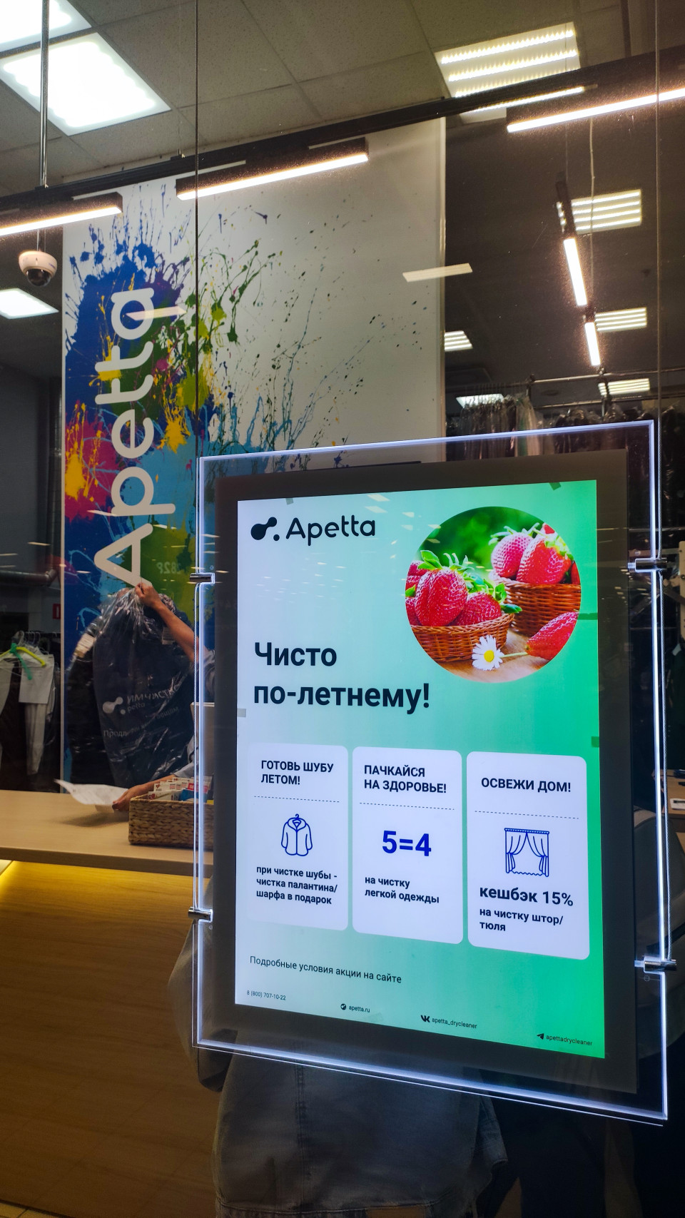 Крупный план рекламного дисплея в прозрачной рамке у стойки обслуживания: на экране промо-сообщение Apetta с летней тематикой, изображением клубники и блоками с условиями скидок. На заднем плане через стекло видны элементы интерьера химчистки: подвесные светильники, часть стойки, одежда в чехлах и купольная камера видеонаблюдения. Съёмка в помещении, акцент на цифровых вывесках и рекламной коммуникации в точке продаж. Использование: статьи о маркетинге, материалах в точке продаж, рекламе в ритейле и оформлении сервисных зон.
