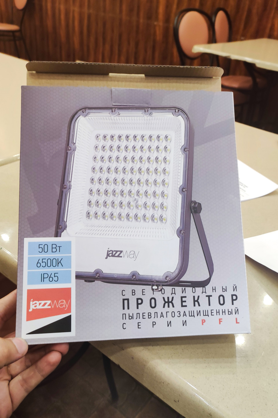 Фотография изображает коробку со светодиодным прожектором Jazzway. На упаковке показан сам прожектор, указаны основные характеристики: мощность, цветовая температура 6500K и степень защиты IP65. Коробка находится в интерьере, на фоне видна мебель и стол. Снимок выполнен при искусственном освещении, акцент сделан на упаковку и информацию производителя. Изображение подходит для использования в обзорах осветительного оборудования, каталогах товаров, материалах о бытовом и уличном освещении.