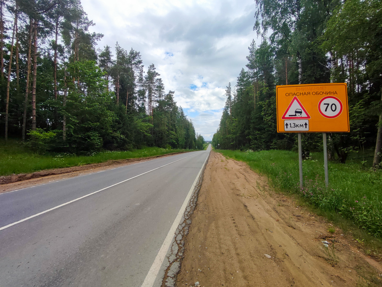 транспорт дорога улица дорожная инфраструктура дорожное движение асфальт городская инфраструктура автотрасса дорожное полотно асфальтированная дорога широкоугольная съемка перспектива дороги дорожная разметка правый край дороги песчаная обочина грунт придорожная трава лес сосны берёзы лесной коридор предупреждающий щит опасная обочина знак 70 ограничение скорости дорожная безопасность предупреждение водителям участок 1 3 км загородная местность пасмурное небо облачность путешествиеПохожие фотографии