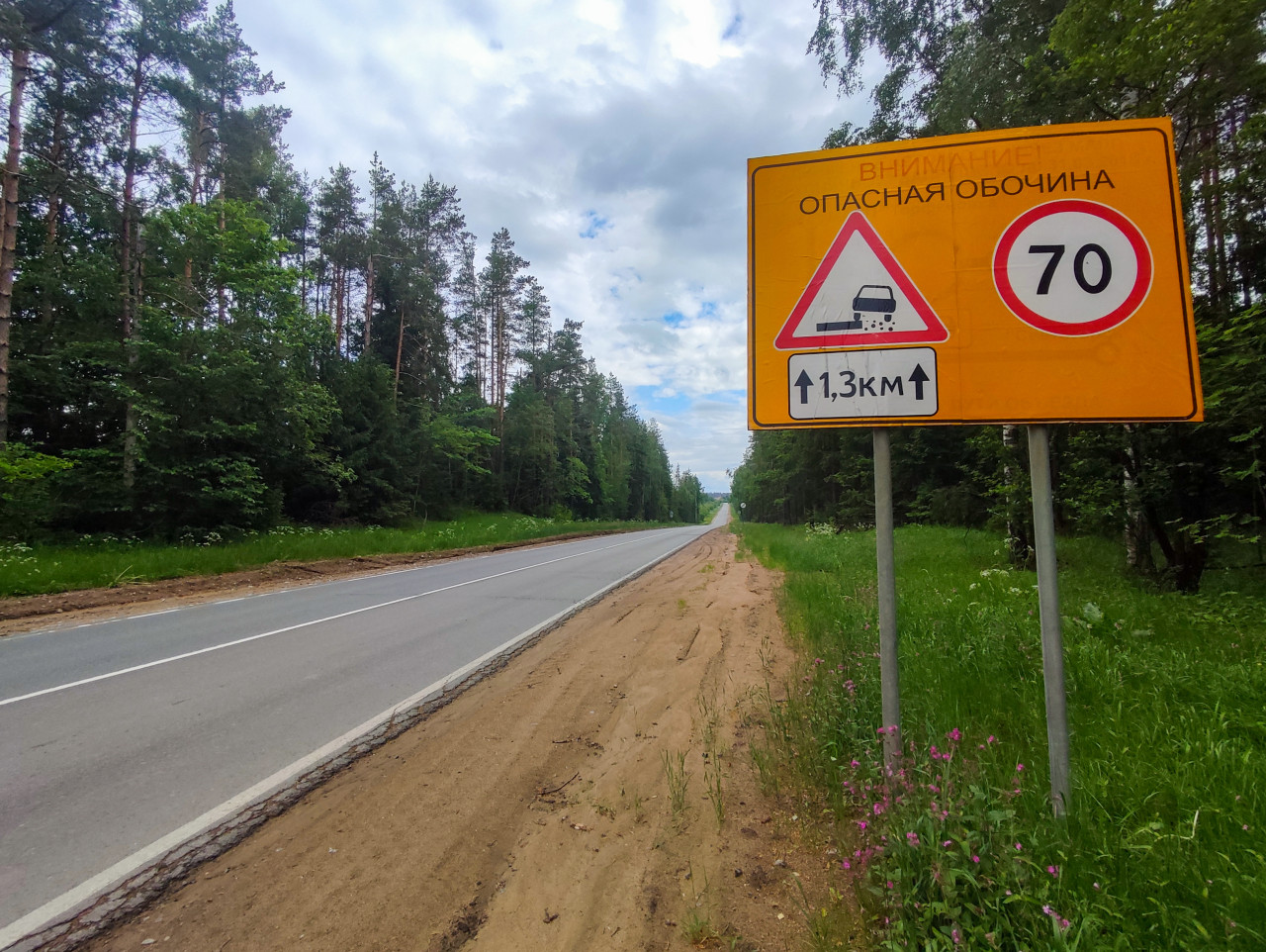 транспорт дорога улица дорожная инфраструктура дорожное движение асфальт городская инфраструктура дорожный знак предупреждение безопасность автомобильная дорога придорожный щит крупный план текст на знаке опасная обочина ограничение скорости 70 табличка 1 3 км дорожная разметка обочина песок стойки знака металлические опоры лес зелёная трава придорожные растения пасмурная погода облака ПДД предупреждающая информация региональная трасса дальняя перспектива контроль скоростиПохожие фотографии
