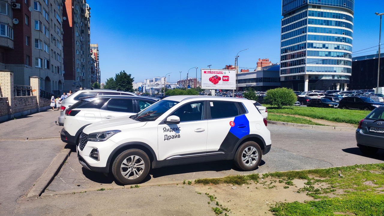 Июнь 2024, городской район: на переднем плане белый кроссовер с фирменной оклейкой каршеринга «Яндекс Драйв», припаркованный у бордюра рядом с другими автомобилями. Видны асфальт, пешеходная зона, пятна песка и травяные островки у кромки парковки. На заднем плане многоэтажные жилые дома, крупный стеклянный офисный корпус и заполненная стоянка; вдали стоит рекламный щит EUROSPAR. Снимок можно использовать для статей о каршеринге, городской мобильности и транспортной инфраструктуре.