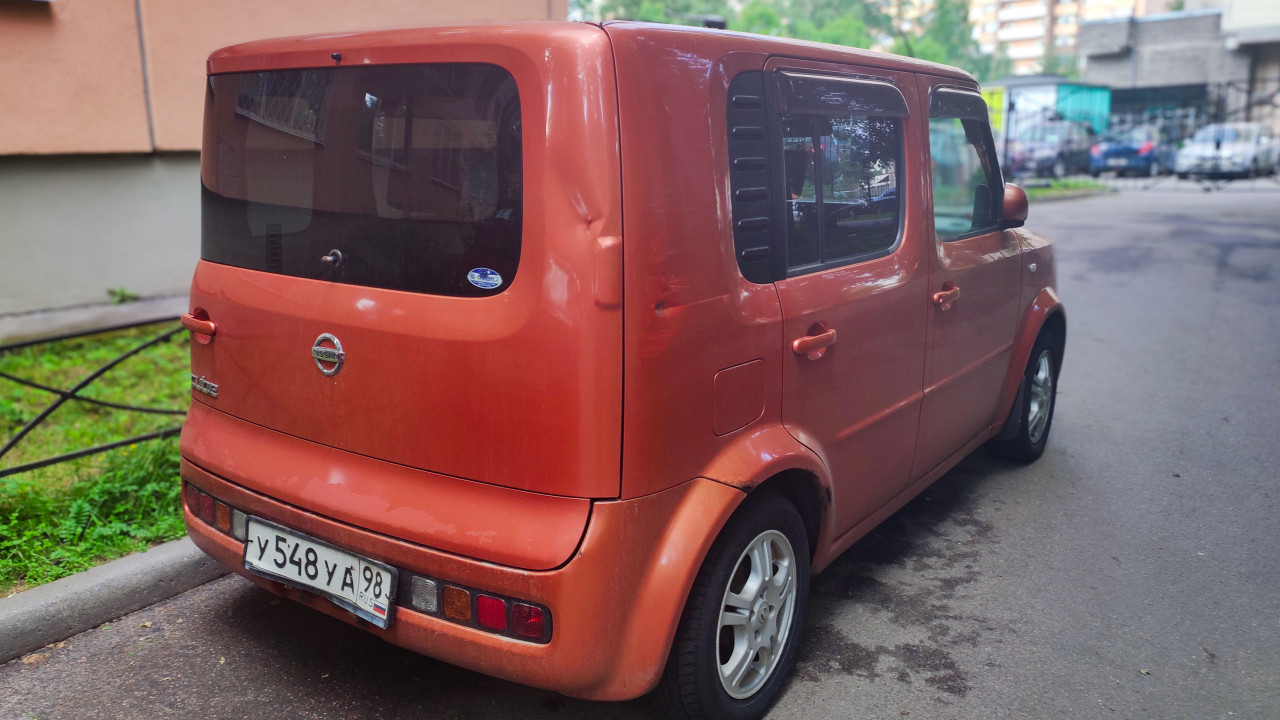 Задняя часть Nissan Cube с номерным знаком и следами эксплуатации