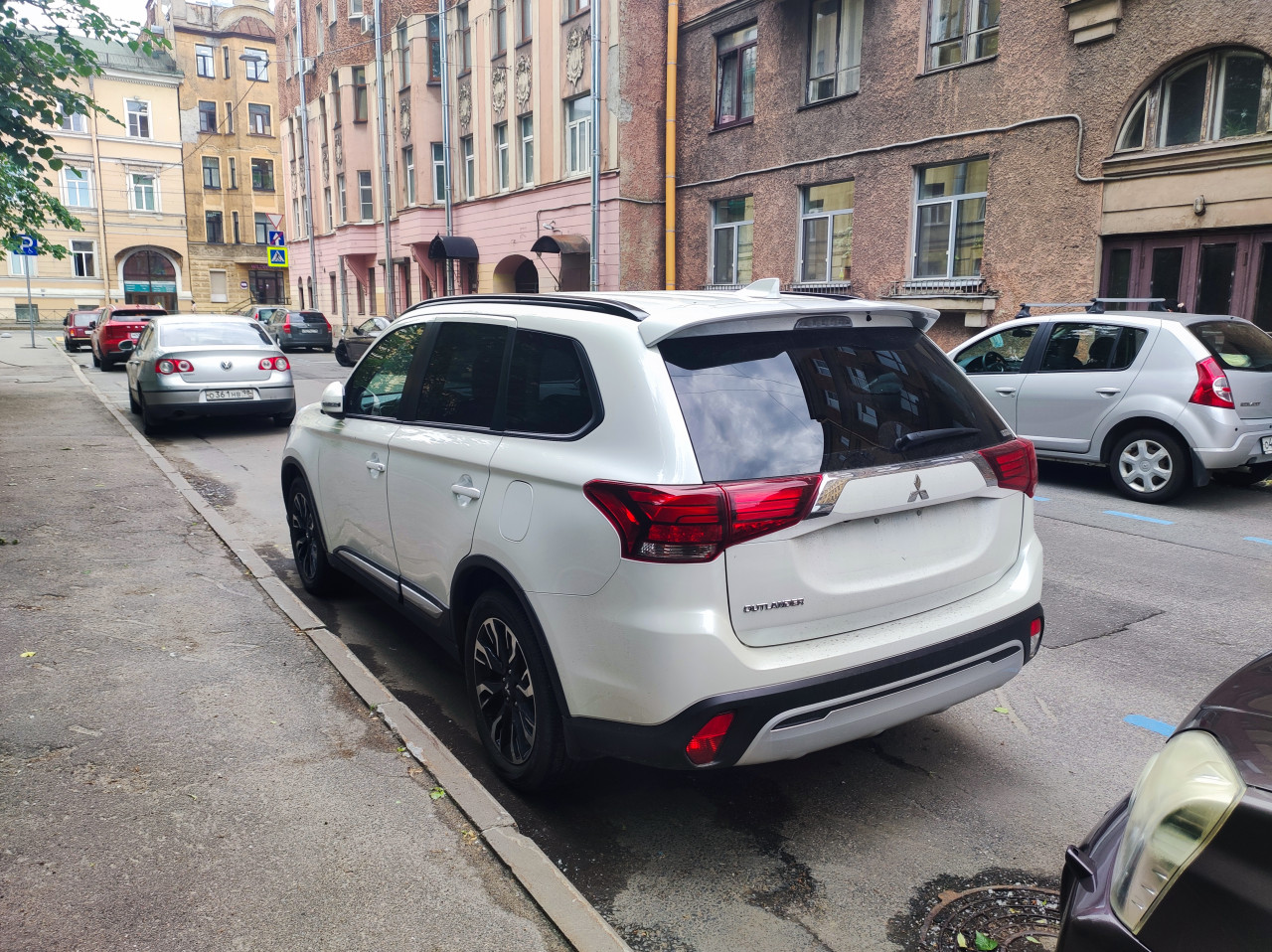 автомобиль легковой автомобиль легковушка машина транспорт авто городской транспорт автотранспорт личный транспорт транспортное средство автомашина кроссовер Mitsubishi Outlander городской двор улица парковка у обочины припаркованный автомобиль задний вид задние фонари багажник шильдик отсутствие номера место под номер жилые дома фасады зданий окна подъезд тротуар бордюр дорожные знаки городская инфраструктура ограда зелёные насаждения деревья влажный асфальт повседневная жизнь уличная фотография дневной светПохожие фотографии