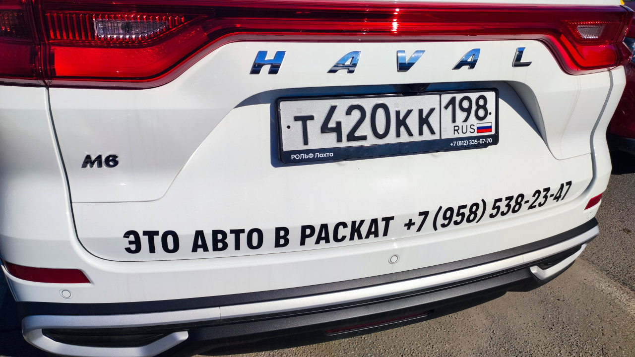 автомобиль легковой автомобиль легковушка машина транспорт авто городской транспорт автотранспорт личный транспорт транспортное средство автомашина деталь автомобиля крупный план задняя часть логотип шильдик модель автомобиля номерной знак рамка номера дилер автосалон брендинг реклама наклейка телефон бампер парктроник задняя оптика пластик лакокрасочное покрытие асфальт солнечный свет кроссовер HAVAL Haval M6 Россия Санкт ПетербургПохожие фотографии