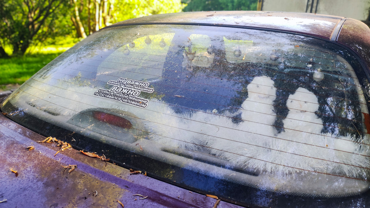 Июнь 2024: общий вид заднего стекла автомобиля, покрытого пылью и следами высохших капель, с небольшой наклейкой с текстом о важности «оставаться человеком» в любой машине. Через стекло просматриваются нити обогрева, на поверхности отражаются кроны деревьев и яркий летний свет. По краям заметны элементы кузова и резинки уплотнителя, на нижней части стекла читается AIR BAG. На стекле лежат мелкие листья и мусор после стоянки под деревьями. Фото подходит для тем про эксплуатацию авто, автодекор, парковку во дворе и визуальные детали транспорта.