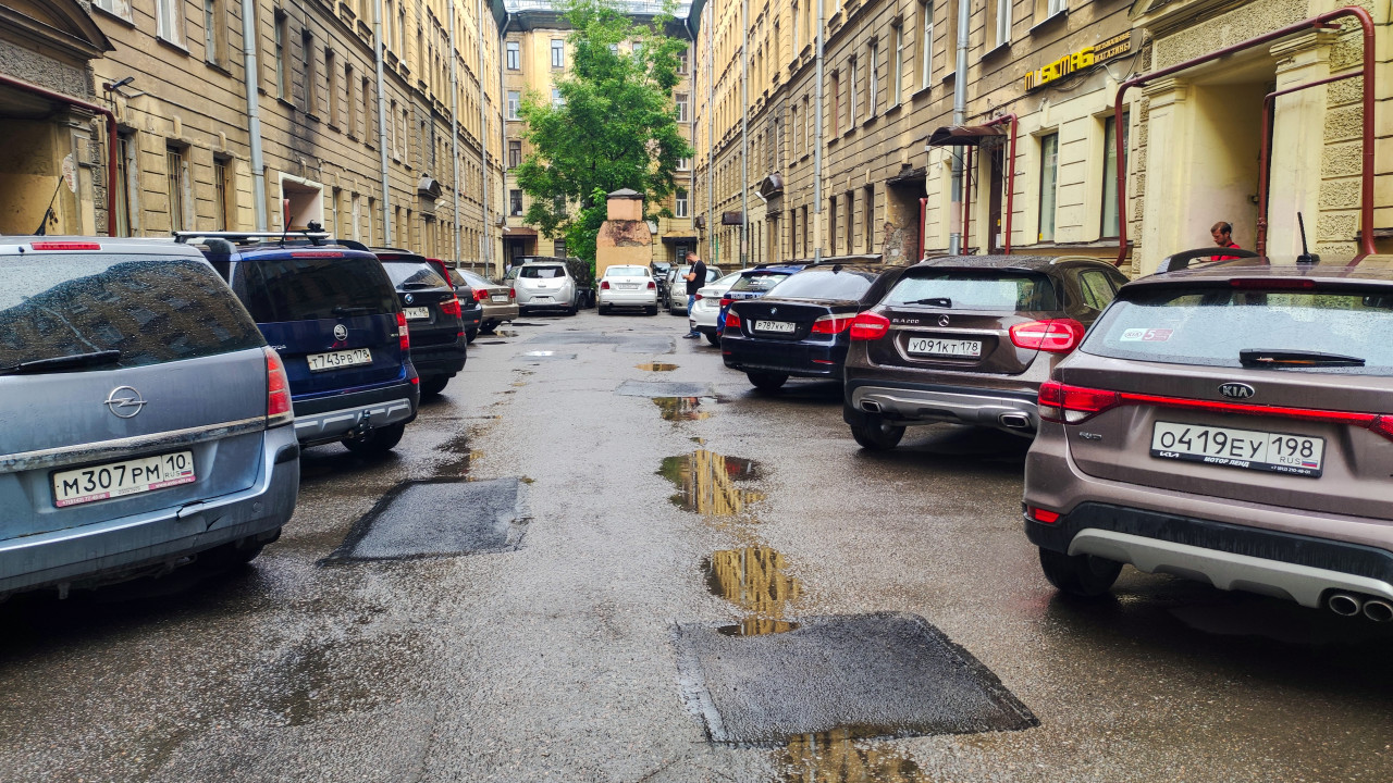парковка автопарковка стоянка автостоянка автомобильная парковка автомобильная стоянка парковочное место парковочная зона парковочная площадка городской пейзаж урбанистика организация парковки зона парковки дорожная инфраструктура город двор двор колодец городская среда жилая застройка фасады домов старые дома дворовый проезд автомобили мокрый асфальт дождь после дождя лужи отражения ямочный ремонт заплатка асфальта водосточные трубы окна подъезд вывеска магазина уличная сцена прохожие дерево во дворе коммунальное хозяйство жкх состояние дорог дворовая инфраструктура Санкт ПетербургПохожие фотографии